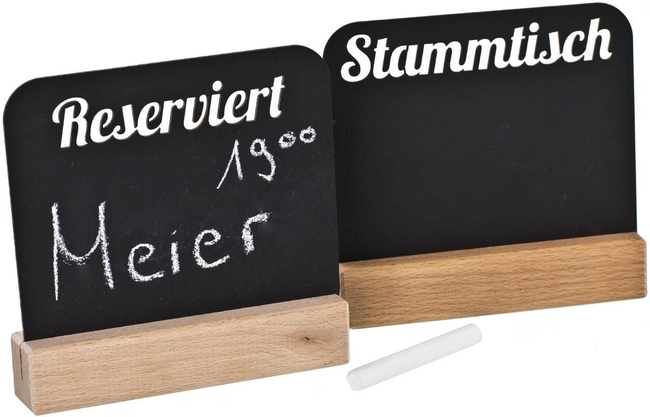 Der Tischaufsteller ist aus hochwertigem Buchenholz gefertigt, das langlebig und robust ist. Die gesteckte Kreidetafel lässt sich leicht beschriften und wieder abwischen und bietet somit eine praktische und kostengünstige Lösung, um Ihre Informationen zu präsentieren.