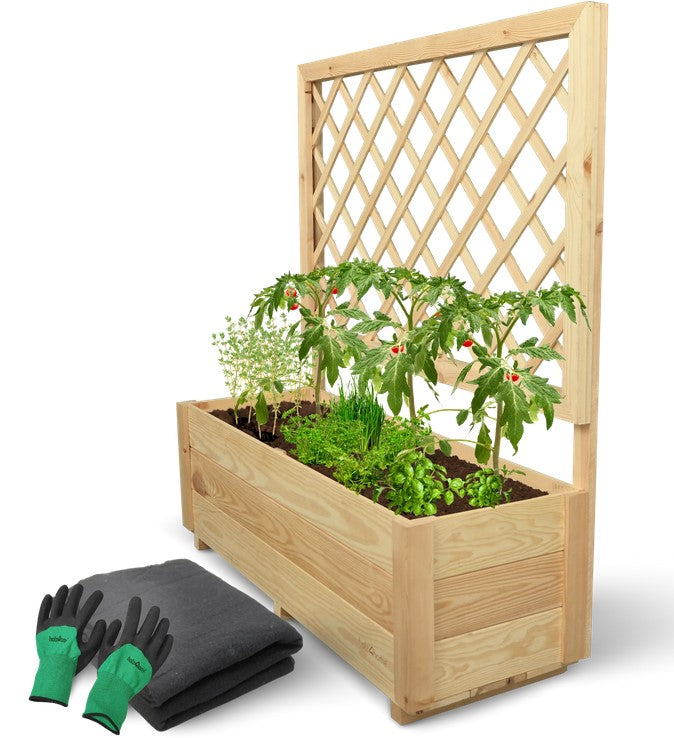 Der Pflanzkasten mit Rankgitter von besteht aus Kiefernholz. Das heimische Holz hat eine hohe Formstabilität und Schrauben halten sehr gut darin. Kiefernholz enthält natürliche Harze und Öle, die es gegen Insektenbefall schützen können. Dies macht es zu einer robusteren Option im Vergleich zu einigen anderen Holzarten, die anfälliger für Schädlinge sind.
