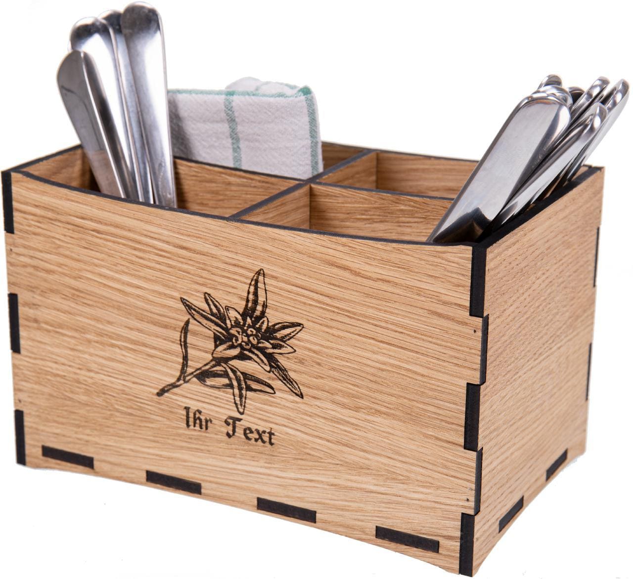 Unser Table Caddy aus geölter FSC®-Eiche ist ein handgefertigter Besteckhalter und Organizer, der aus hochwertigem FSC Eiche A/A Schichtholz mit MDF Kern hergestellt wird. Die Verwendung von Schichtholz und MDF Kern sorgt für eine hohe Stabilität und Langlebigkeit des Produkts. Die geölte Oberfläche betont dabei die natürliche Schönheit des Holzes und verleiht dem Table Caddy ein rustikales Aussehen.
